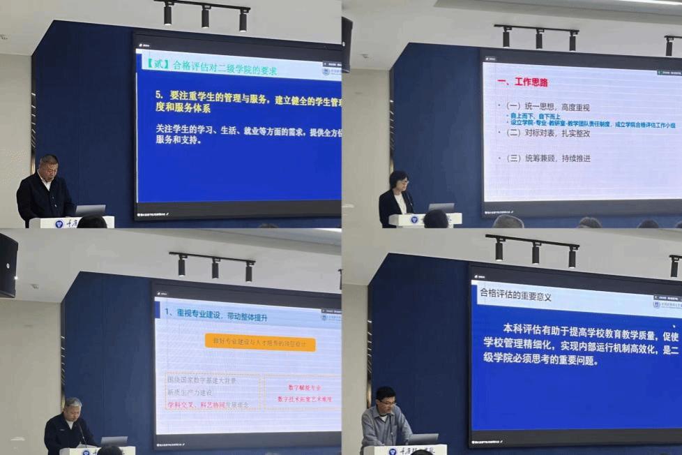 主题发言环节,三校四区二级学院代表围绕“二级教学单位如何做好迎评促建工作”进行经验分享。重庆移通学院数字经济与信息管理学院潘显兵院长从二级学院的现状分析、评估对二级学院的要求、二级学院内涵建设路径、学院的“痛”与对策等四个方面对评估工作做了分析与探讨;淬炼商学院曾璐院长以“淬炼商学院迎评促建工作思路与具体举措”为题,分享了学院在专业建设、课程建设、基层团队建设、实验实训条件建设、师资队伍建设等情况以及在建设过程中遇到的问题和挑战;晋中信息学院艺术传媒学院盛卓立院长“以合格评估为契机,指引二级学院专业建设持续改进”为主题,从评估工作中二级学院建设与发展、以自我评估实践带动专业发展、以评促建提高专业建设水平等三个方面进行了分享;泰山科技学院智能工程学院张涛然院长介绍了合格评估背景下二级学院的建设与发展情况,并分享了学院的迎评工作思路和举措。