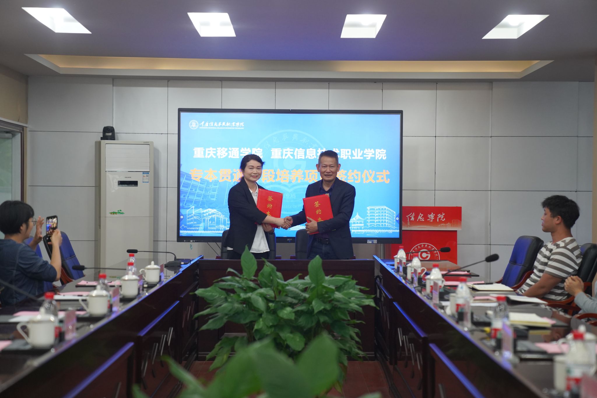 经过充分的沟通与深入的探讨,孙玺与高世俊两位校领导代表双方学校共同签署了合作协议。根据协议,我校与重庆信息职业技术学院将开展专本贯通分段培养项目,专科专业软件技术对接本科软件工程专业,学生在重庆信息技术职业学院学习3年后,通过转段考试升至我校继续学习2年,两校将协同教学,共同推动学生实现高水平发展。