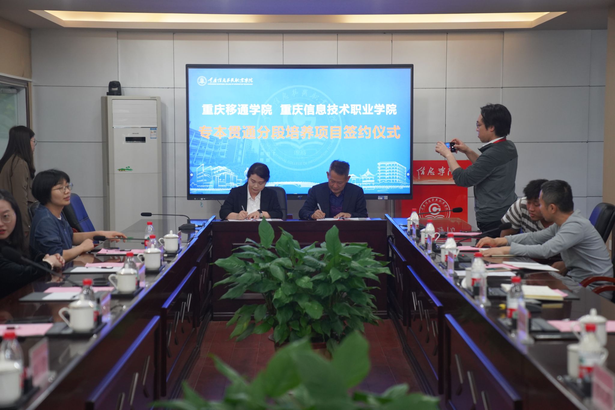 2024年4月29日下午3点在重庆信息技术职业学院会议室,我校与重庆信息技术职业学院成功举行了专本贯通分段培养联合办学协议签约仪式。我校副校长孙玺、教务处副处长钟波、信息安全学院主持工作副院长王宁、招生处办公室副主任赵兵、软件教研室主任邓秋菊、软件专业负责人赵星月等出席本次签约仪式。双方就软件工程专业“3+2”专本贯通分段培养项目进行探讨,并续签2024年软件工程专业“3+2”专本贯通分段培养项目。