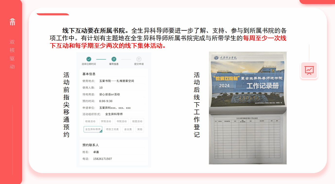 为深入贯彻“以学生充分发展为中心”的育人理念,内化“四位一体双院制+特色课程”人才培养模式,在双院育人长效运行机制大背景下,充分发挥全生异科导师“知心朋友、成长伙伴、人生导师”的重要育人角色。4月以来,各书院认真履行机制运行协同、场域空间保障、导师团队互通、活动资源共享的工作职责,先后开展书院全生异科导师见面会,加强了全生异科导师对书院的身份认同、情感认同和价值认同,帮助异科导师快速融入书院并明确职责职权,促进多维协同共育。