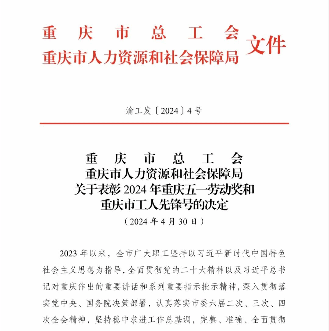 4月30日,由重庆市总工会、重庆市人力资源和社会保障局开展的2024年重庆五一劳动奖和重庆市工人先锋号结果出炉,我校继2022年荣获“重庆市工人先锋号”称号后,今年荣获五一劳动奖状!
