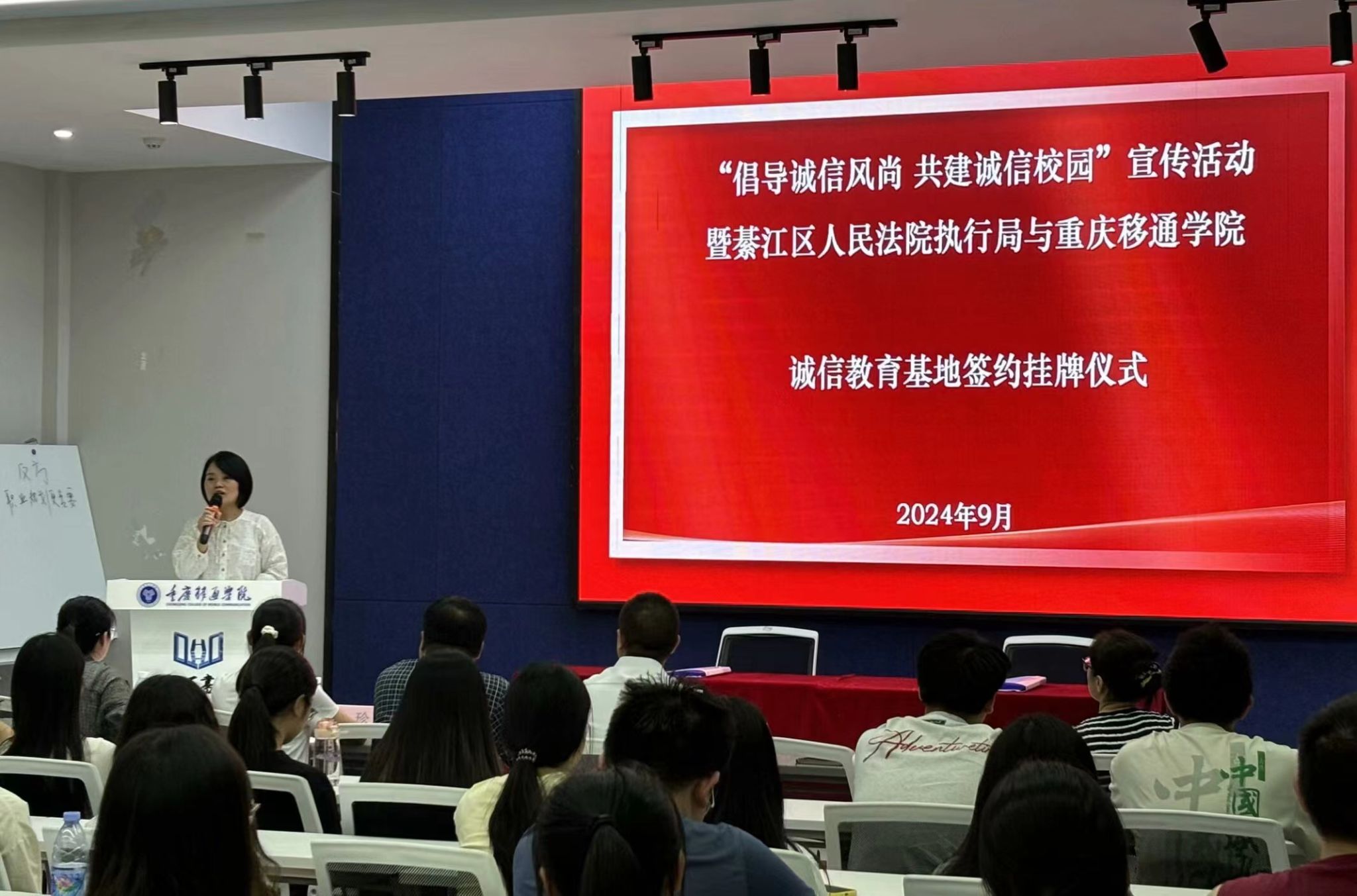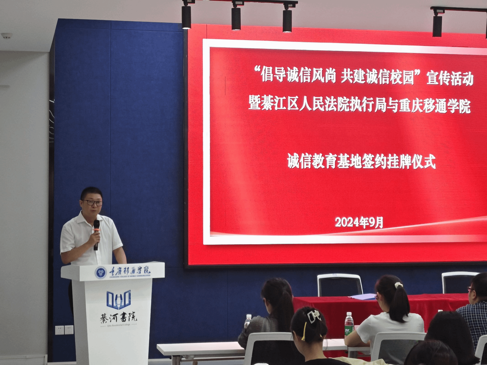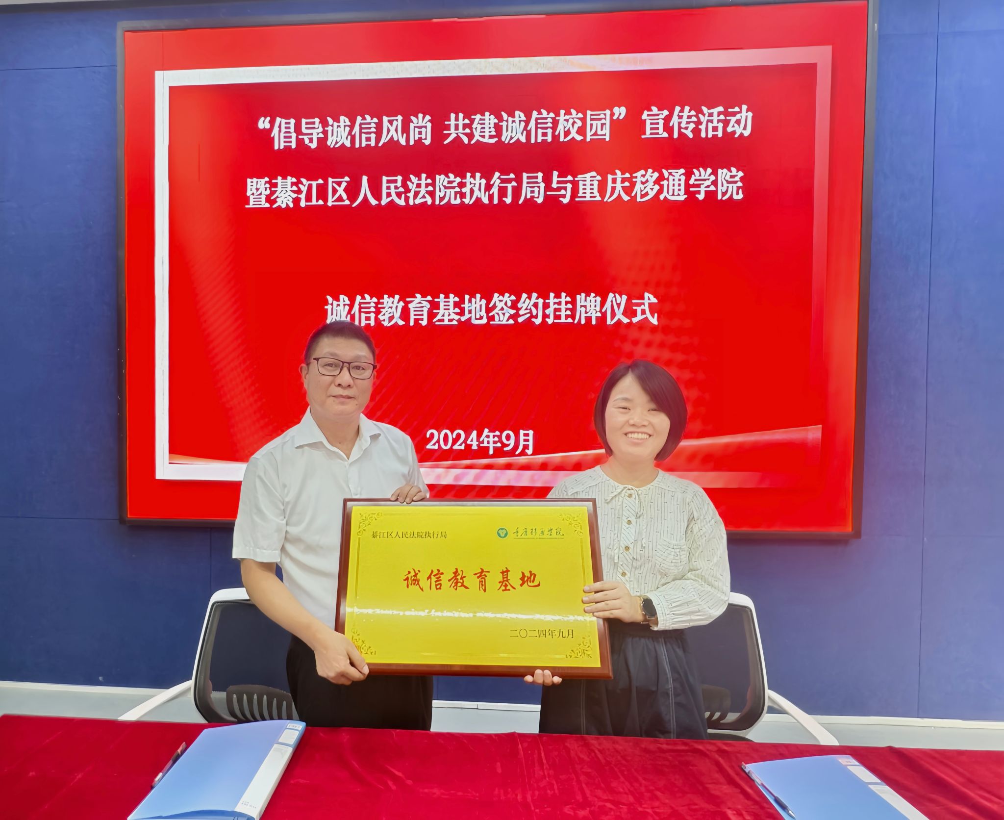 为推动高等院校教学与实务实践优势互补、资源共享,共同建设诚信校园,培养诚信公民,2024年9月27日,重庆移通学院与綦江区人民法院执行局在重庆移通学院綦河书院观涛多功能会议室隆重举行了“诚信教育基地”揭牌仪式。綦江区人民法院执行局副局长张亦军、重庆移通学院校长助理谢银平出席揭牌仪式,双方有关负责人及教师代表、干警代表参加揭牌仪式。