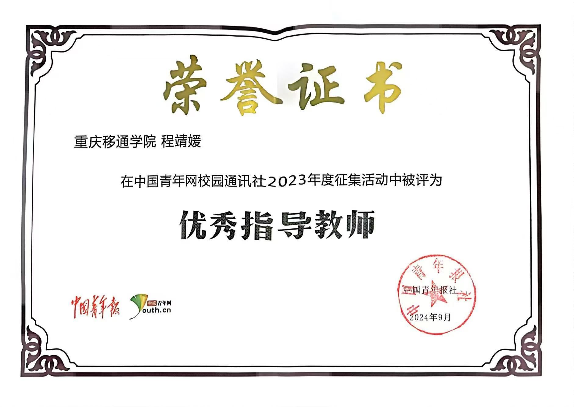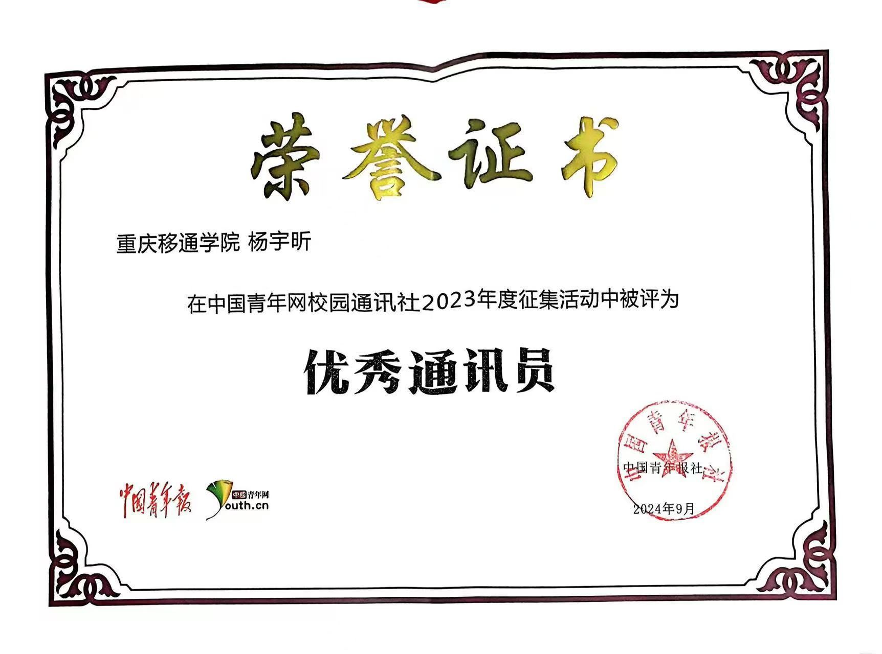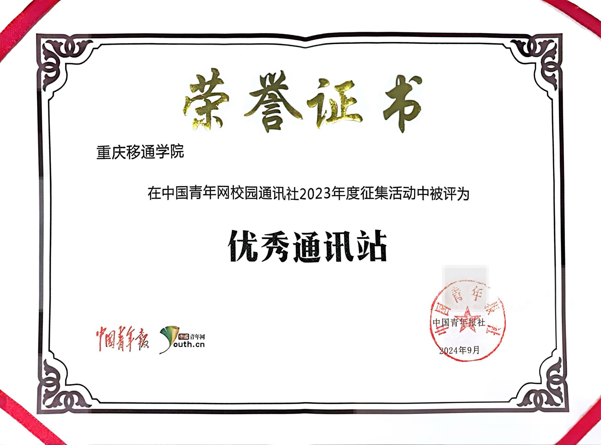 近日,由中国青年网举办“中国青年网校园通讯社2023年度征集活动”结果公布,经过作品初审、网络展示、打分复审、年度综合审核等环节,最终,由学校品牌营销与新闻中心运营的重庆移通学院通讯社在全国高校中突出重围,获评2023年度“优秀通讯站”称号,品牌营销与新闻中心程靖媛获评“优秀指导教师”称号,学生新闻中心主席、大数据学院学生杨宇昕获评“优秀通讯员”称号,3项国家级奖项收入囊中!