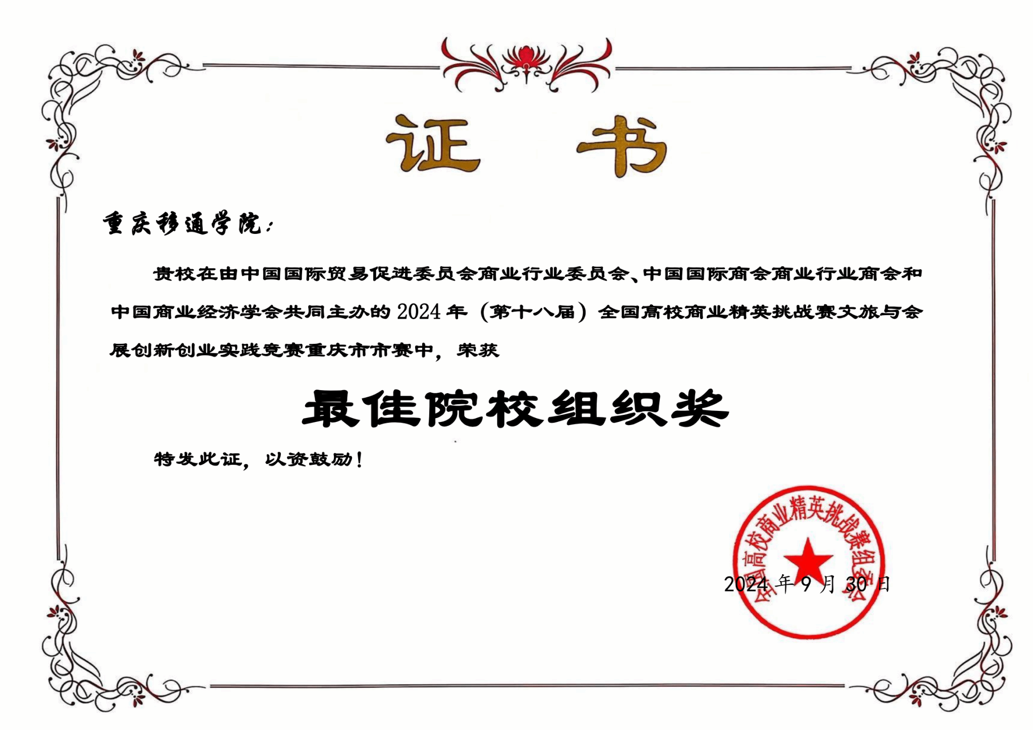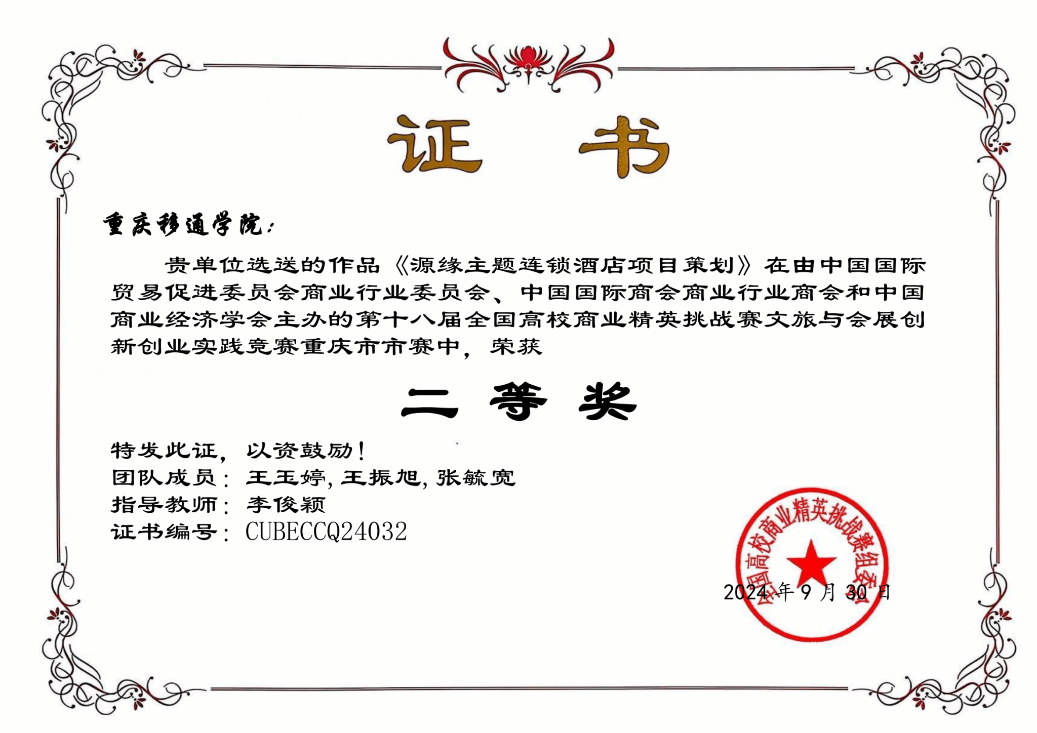 近日,由中国国际贸易促进委员会商业行业委员会、中国国际商会商业行业商会和中国商业经济学会主办的第十八届全国高校商业精英挑战赛文旅与会展创新创业实践竞赛重庆市市赛中,获评2024年度“最佳院校组织奖”称号,酒店商务产业学院的三名优秀学子在酒店商务产业学院项目主管李俊颖老师的指导下,凭借其出色的酒店策划项目荣获重庆市二等奖,成功晋级国赛。