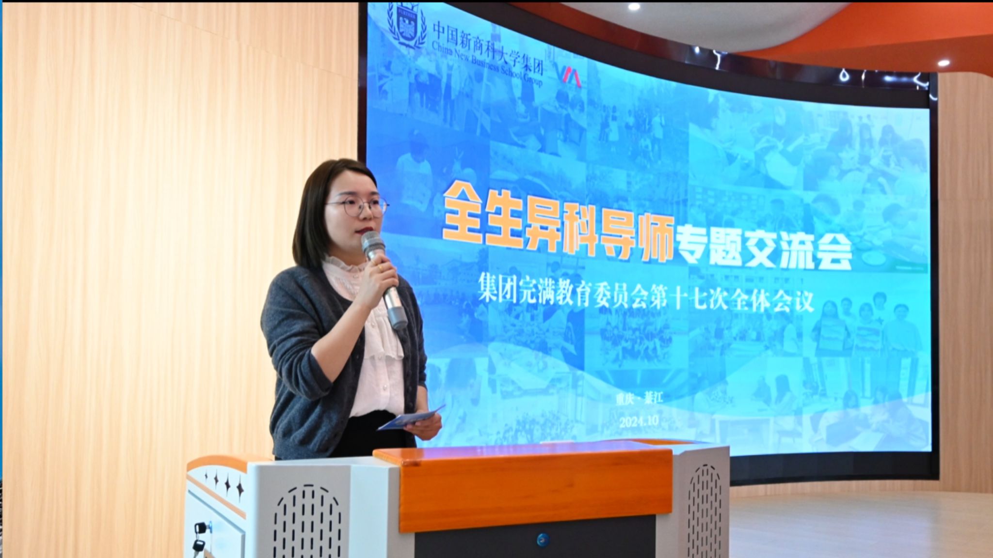 金凤摇落千林果,丹桂飘香满校园。2024年10月18日-19日,中国新商科大学集团完满教育委员会第十七次全体会议在重庆移通学院綦江校区召开。为给学生提供可感知、可体验、可参与的教育环境,促进集团三校四区全生异科导师制的交流与学习,解决工作开展过程中的困难,10月18日下午,三校四区全生异科导师专题会议在古剑书院·含光报告厅召开,集团完满教育委员会成员、学院主持工作院长代表、全生异科导师制领导小组成员单位负责人、全生异科导师专项工作负责老师、全生异科导师代表参会。