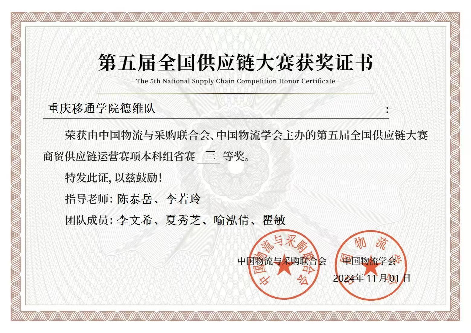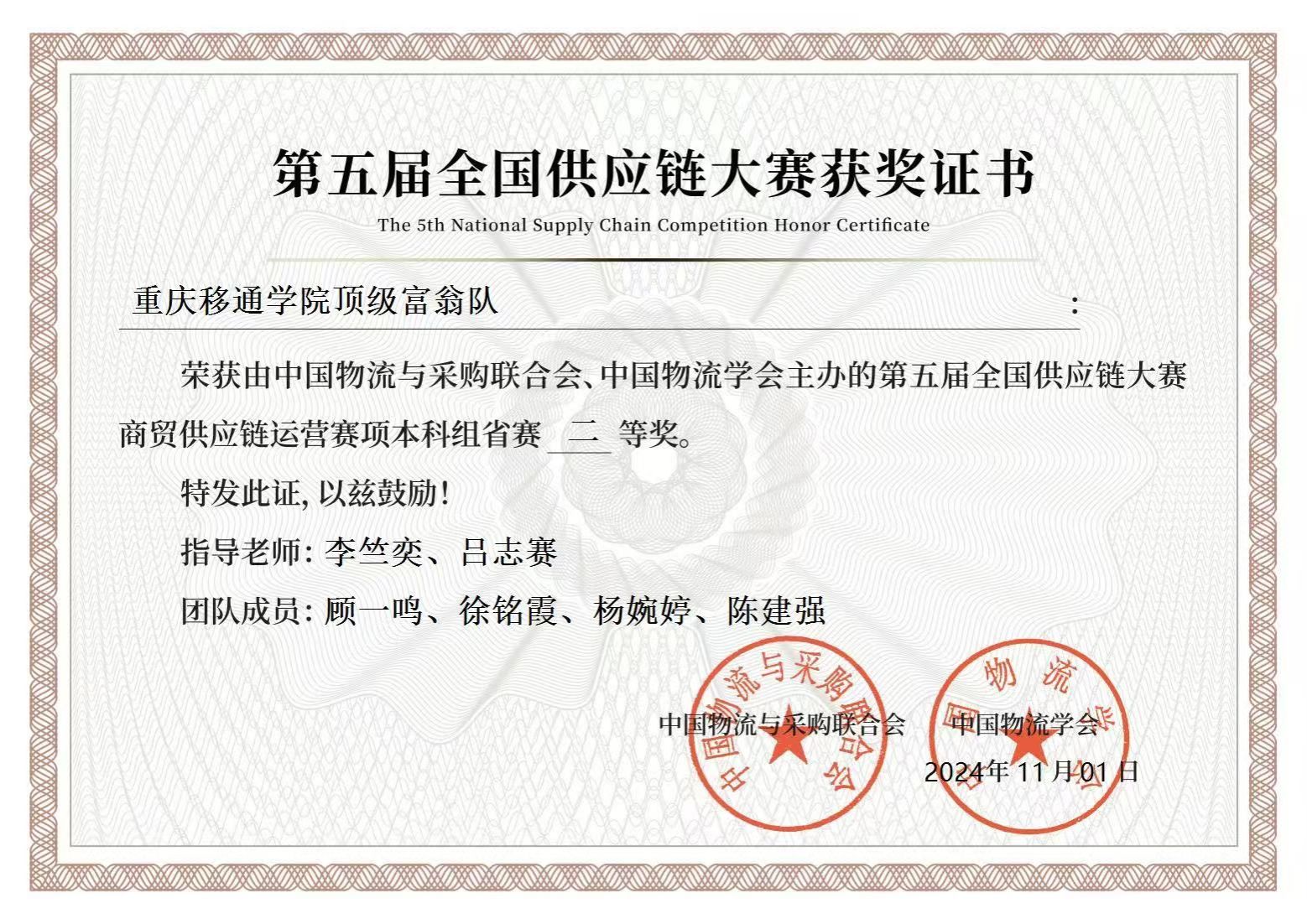 第五届全国供应链大赛商贸供应链运营赛项自启动以来,就受到了广泛的关注和参与。经过层层选拔和激烈角逐,最终有数十支优秀团队脱颖而出,进入了省赛。而重庆移通学院的顶级富翁队和德维队能够荣获二等奖和三等奖,不仅是对他们实力的肯定,更是对他们努力和付出的最好回报。