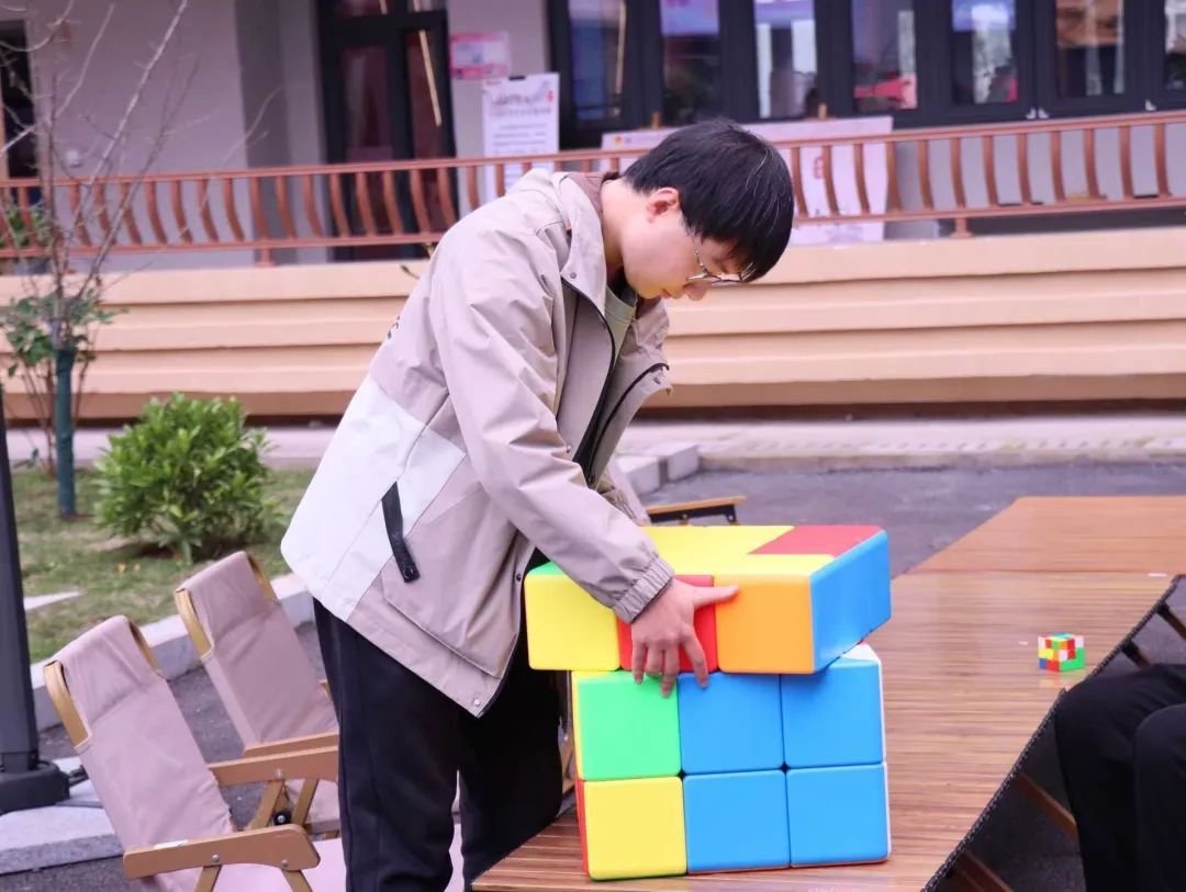 以本次赛事为契机,重庆移通学院充分集合各方的专业知识资源、人才资源、赛事活动经验及社会资源深化合作,让学生走进专业领域、让专家走进高校校园。邀请“最强大脑”魔方全国四强、专业魔方盲拧选手、教练员石欣到场与同学们开展讲座,从比赛技巧到赛事准备再到心态调整,与参赛者们友好交流。不仅如此,主办方在比赛现场结合魔方开展了“弈棋魔方竞技”“魔方秀字大比拼”“一分钟魔方挑战”等互动体验项目。