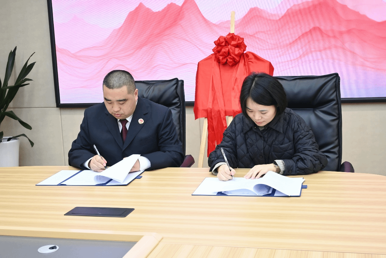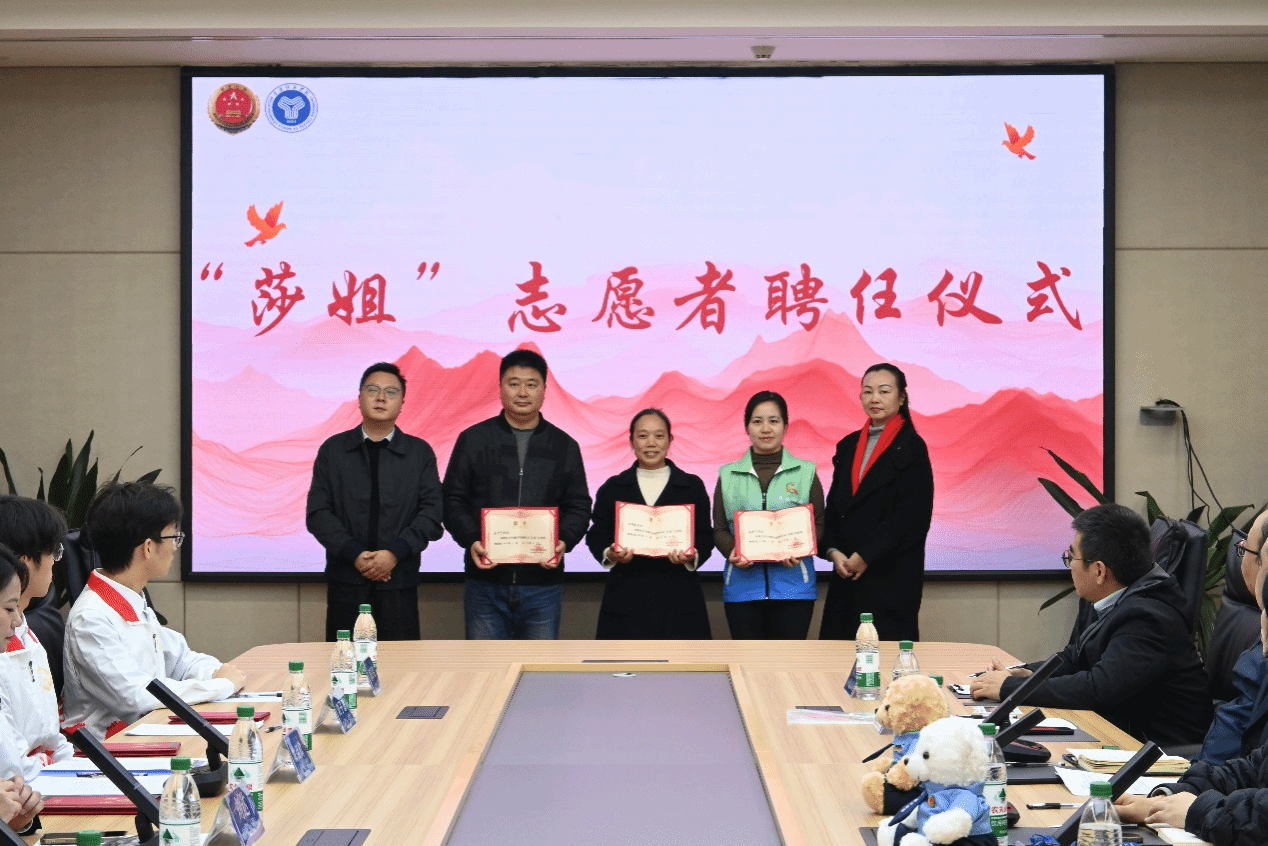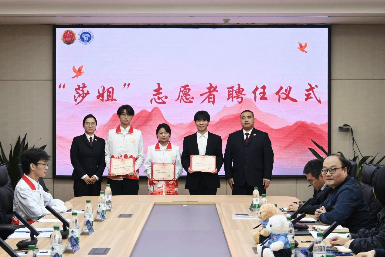 随后,綦江区人民检察院党组成员、政治部主任帅育强与校长助理谢银平代表检校双方签署协议并互赠文创,正式达成检校共建合作,区委政法委政治处主任霍洋与重庆移通学院校长助理谢银平共同为检校共建“莎姐”观护基地揭牌。綦江区人民检察院政治部主任帅育强、綦江区妇女联合会副主席林小惠、綦江区人民检察院检察六部主任张婷、綦江区司法局普治科科长张明剑为新聘綦江区“莎姐”志愿者刘达、姚佳欣、刘子政、孟永丰、周朝喜、赵春宇颁发聘书。