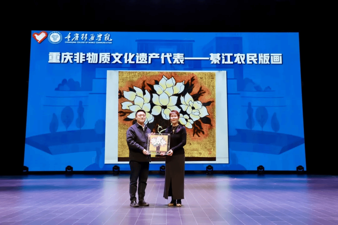 讲座结束后,刘进将本次《名家大讲坛》课酬全部捐赠给重庆移通学院爱心基金。团委副书记、爱心基金管理办公室副主任蔡星宇为刘进颁授捐赠证书,证书背面印着重庆非物质文化遗产——綦江本土农民版画。