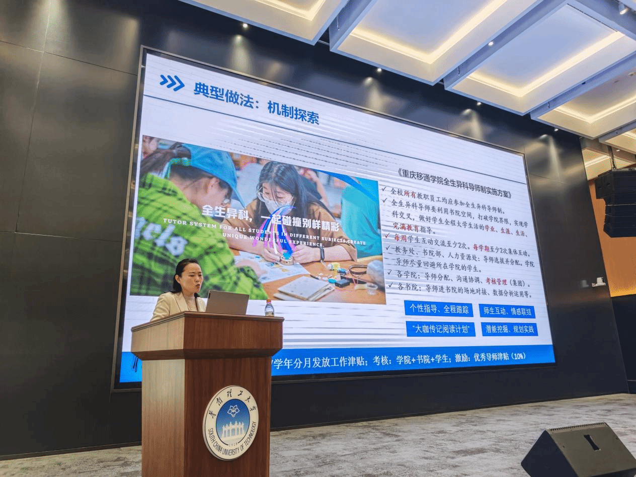研修班分别以高校治理现代化、数字赋能、学生群体特征、学生社区队伍入驻等方向为专题,邀请来自全国高校思想政治工作网、西安交通大学、华南理工大学等高校的6名专家学者开授课程。大学生思想教育与实践研究中心副主任、西安交通大学副教授顾蓉在《高校“一站式”学生社区对于入驻》的专题讲座中,以重庆移通学院书院全生异科导师专项工作为例,与现场学员共同探讨高校书院社区建设情况。值得一提的是,重庆移通学院是唯一在本次研修全部专家讲座中被提及举例的民办高校。