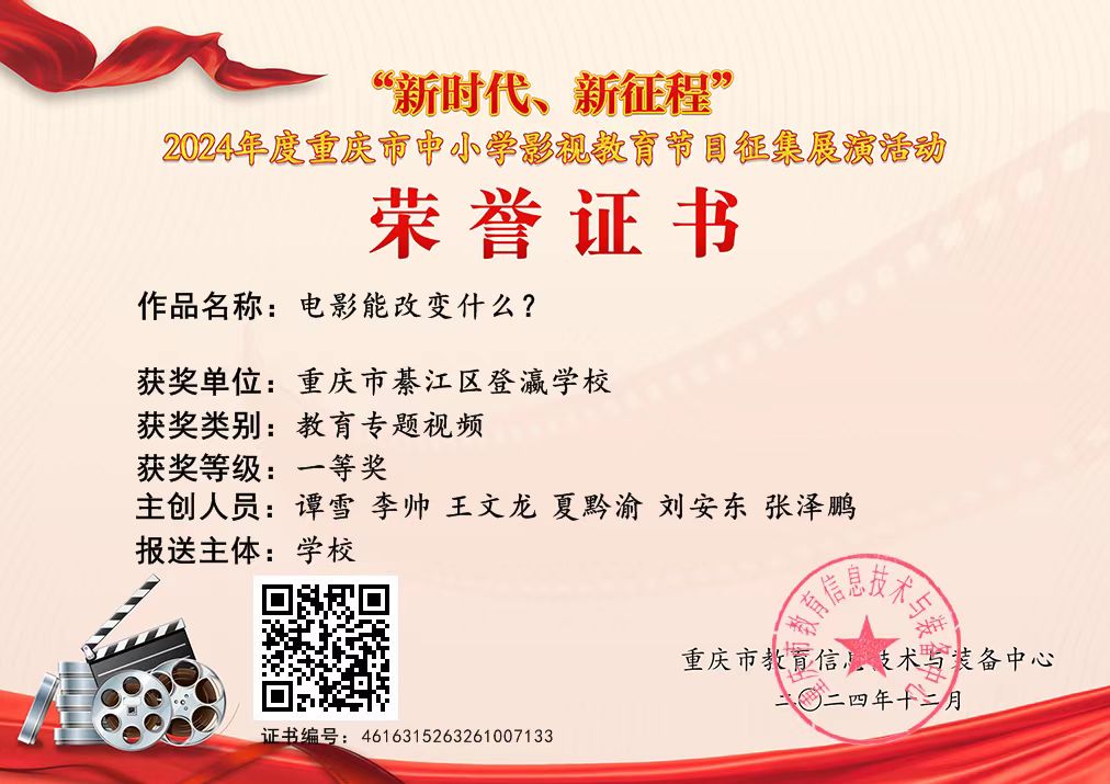 近日,重庆移通学院电影美育实践基地传来喜讯,由电影评论中心师生制作,由基地对口合作单位綦江区登瀛学校报送的短片《电影能改变什么?》在“新时代、新征程”2024 年度重庆市中小学影视教育节目征集展演活动中,荣获一等奖!