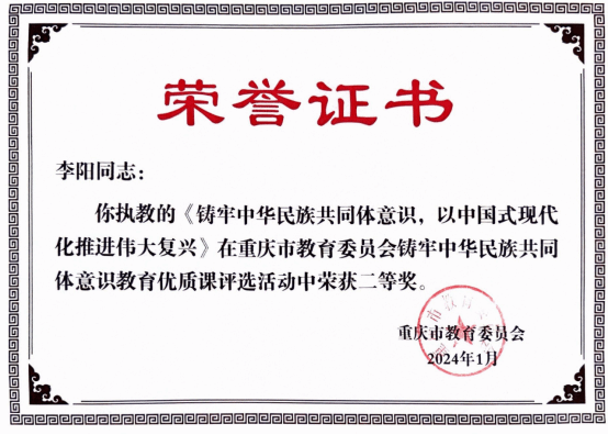 在2024年铸牢中华民族共同体意识教育优质课比赛中,我校马克思主义学院李阳老师执教、陈静老师指导的作品《铸牢中华民族共同体意识,以中国式现代化推进伟大复兴》荣获高校组二等奖。